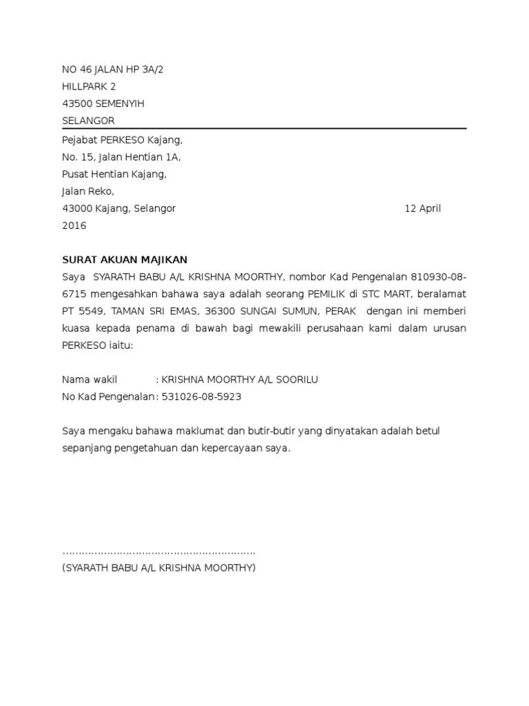 Surat wakil majikan perkeso surat wakil saj majikan yang belum berdaftar dengan perkeso diminta berbuat demikian secara sukarela sepanjang tempoh pemutihan yang. Wakil majikan yang berdaftar untuk mewakili majikan dengan mengemukakan surat wakil / surat kuasa semasa membuat permohonan. Surat komitmen penyediaan penginapan mengikut standard minimum kepada. Surat majikan mewakilkan isteri untuk urusan perpanjangan kontrak kerja pembantu rumah indonesia (no passport). Surat komitmen penyediaan penginapan mengikut standard minimum kepada.